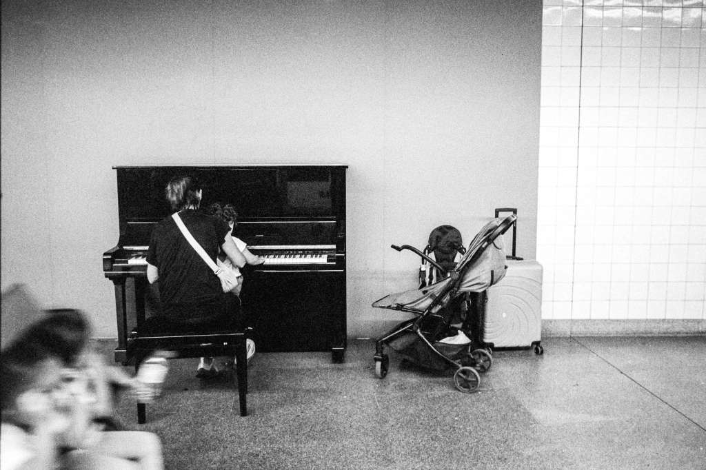 Mãe e filha a tocar piano.