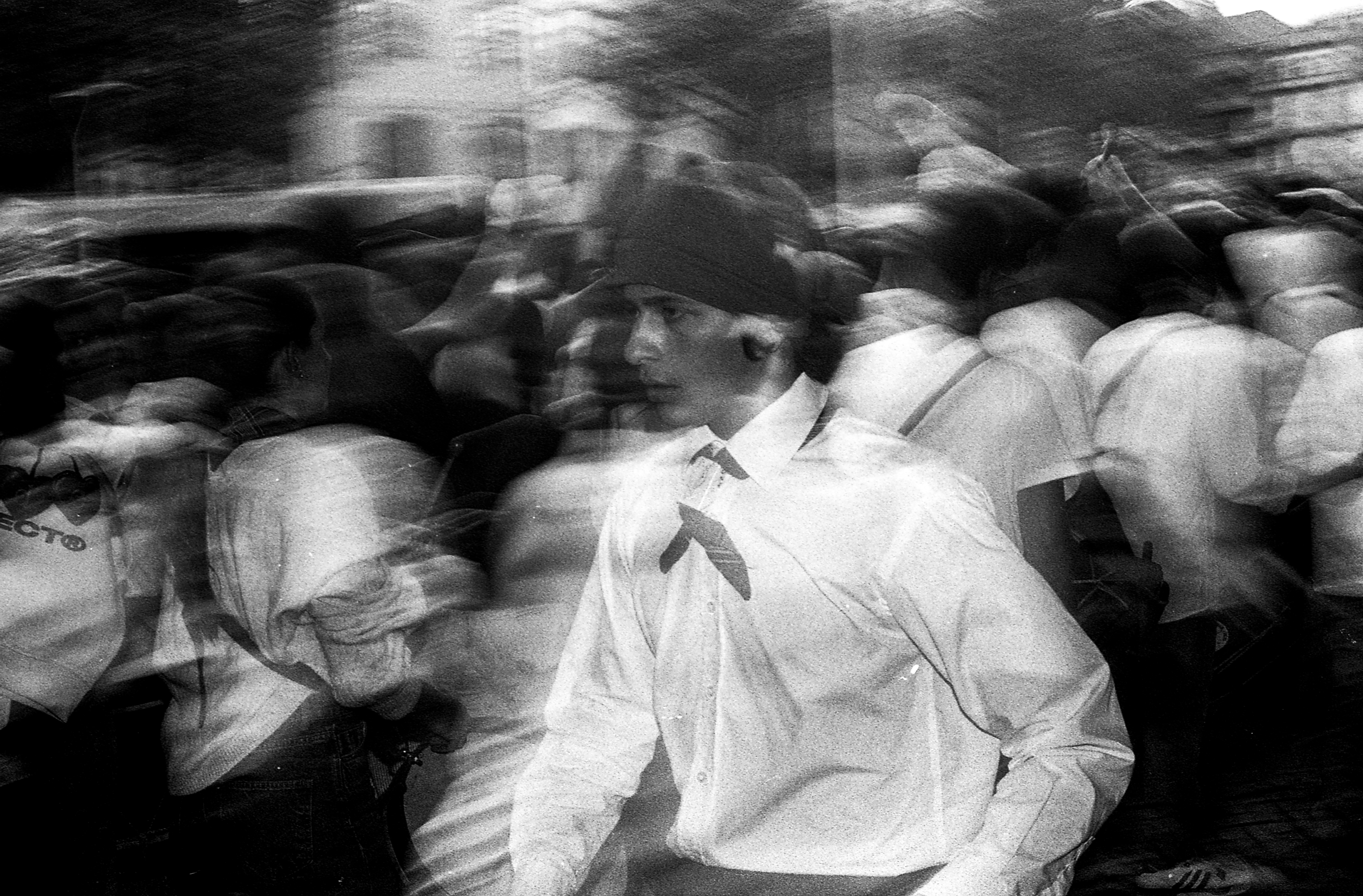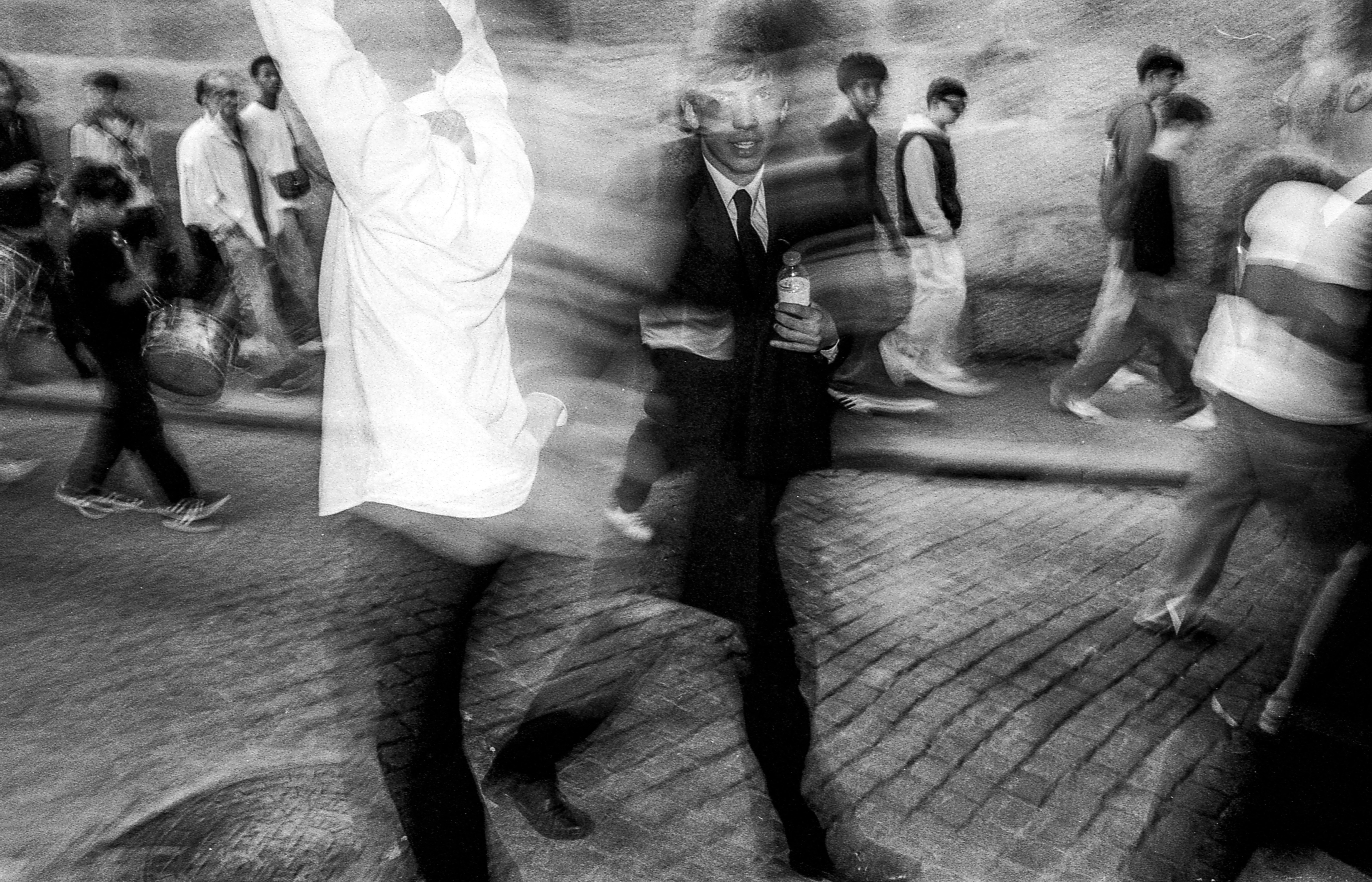 A luz ambiente permite o arrastar do movimento e o “flash” permite o estatismo. Era precisamente esta simbiose que procura na realização das imagens. É um misto de presença com caos visual.