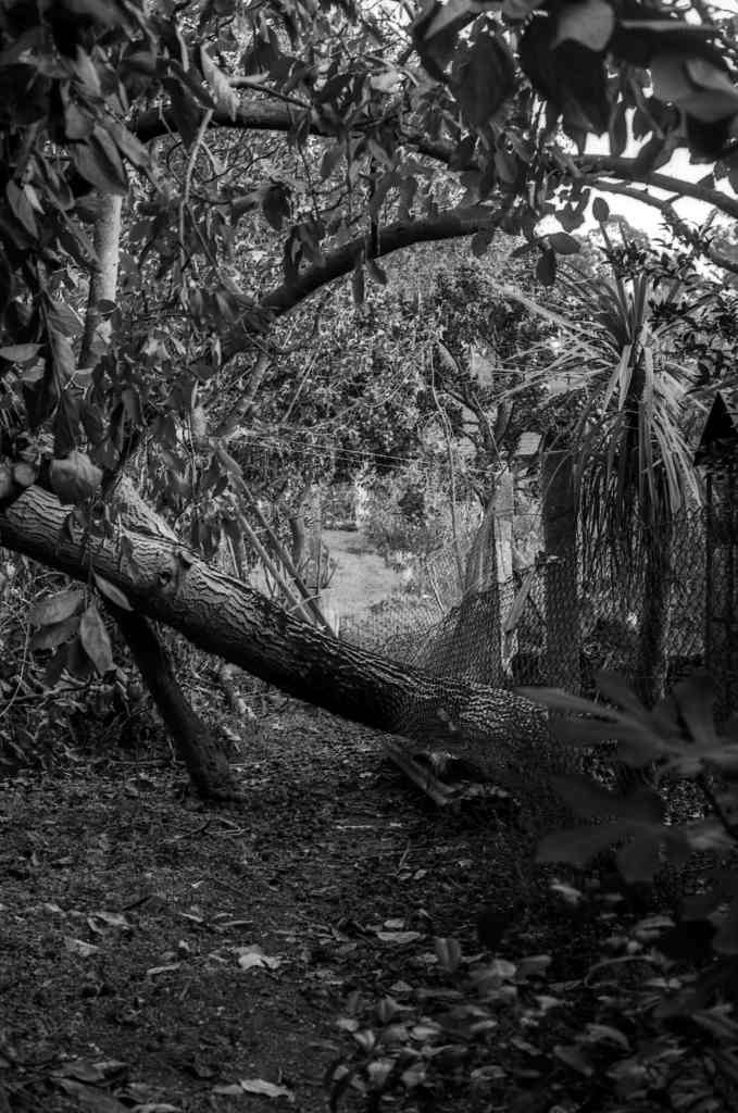 A nogueira encontrava-se dentro do galinheiro. A tempestade fez com que a mesma caísse no sentido do caminho de acesso ao campo caindo esta também por cima desta rede protetora do galinheiro, danificando-a. Isto permite uma maior facilidade de caça de possíveis predadores. Neste sentido seria de extrema importância e urgência desmanchar esta nogueira.